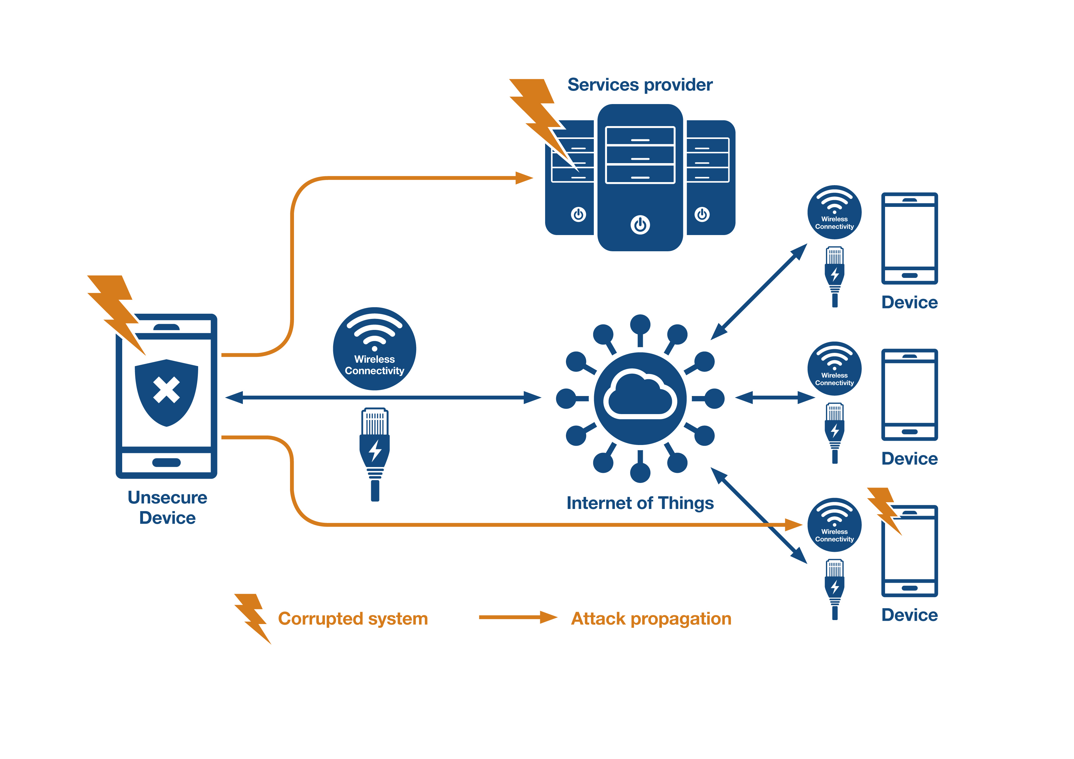 Should an adversary gain access to a device’s firmware, they can potentially reverse engineer the code. With an insight into how the code works, an adversary can uncover further vulnerabilities and has the opportunity to inject malicious code. Access to a single unsecured connected IoT device can compromise a whole IoT deployment – see Figure 1.