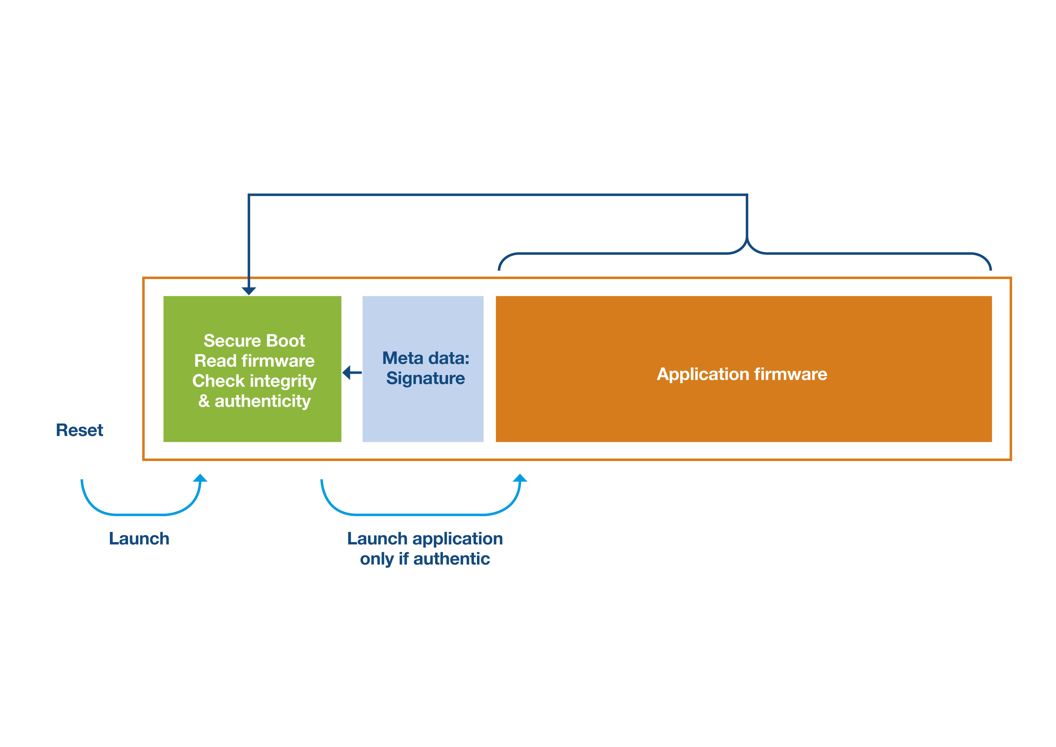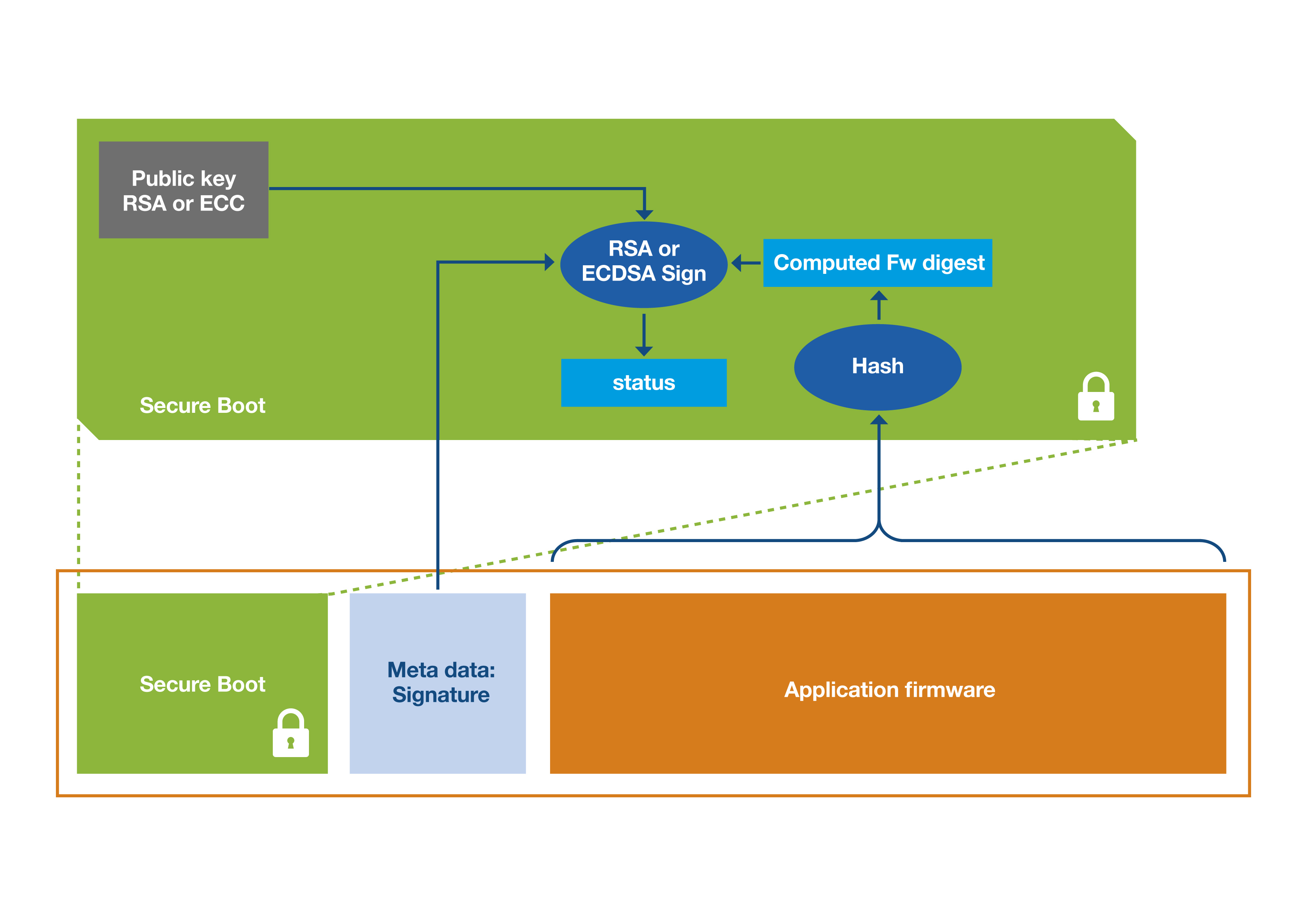 The basic principle behind a secure boot is that on device reset, secure boot code executes and verifies that the application firmware is authentic before deciding to launch it or not. Secure boot relies on two parameters.