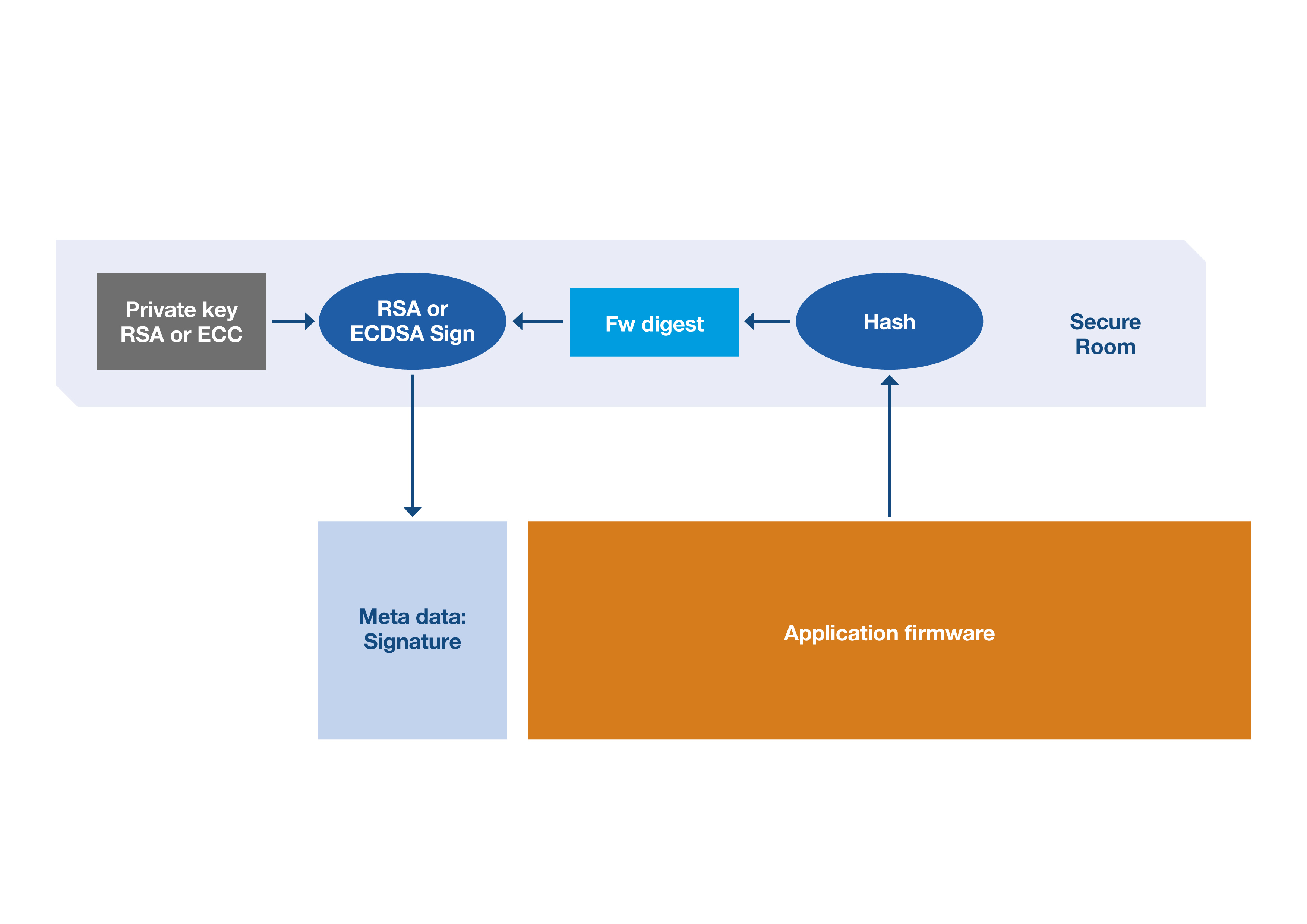 The reference hash value and the signature value always need to be provided with the firmware. These are typically stored in a container, either called metadata or a header – see Figure 6. The metadata does not need encryption because of the method of generation. Should an attempt to use malicious firmware be made, there is no way to make the firmware hash match the reference. Figure 6 illustrates the metadata signature’s construction, using the hashed firmware digest and the private key.