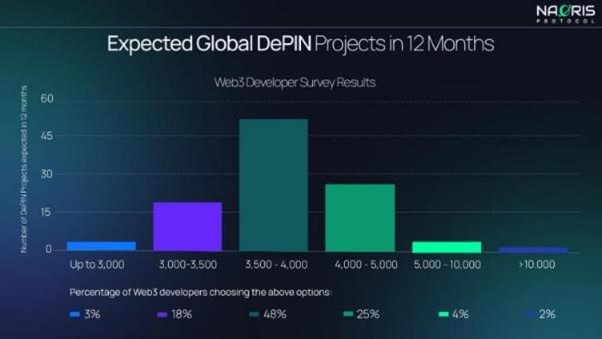 Currently it is estimated that 2,369 DePIN projects are underway globally. Naoris Protocol asked Web3 developers how many DePIN projects they believed there would be globally within 12 months. The research found that nearly a third (31%) of Web3 developers expected the number to grow to 4,000 or more within the year – the infographic below shows the findings that Web3 developers chose from the options provided.