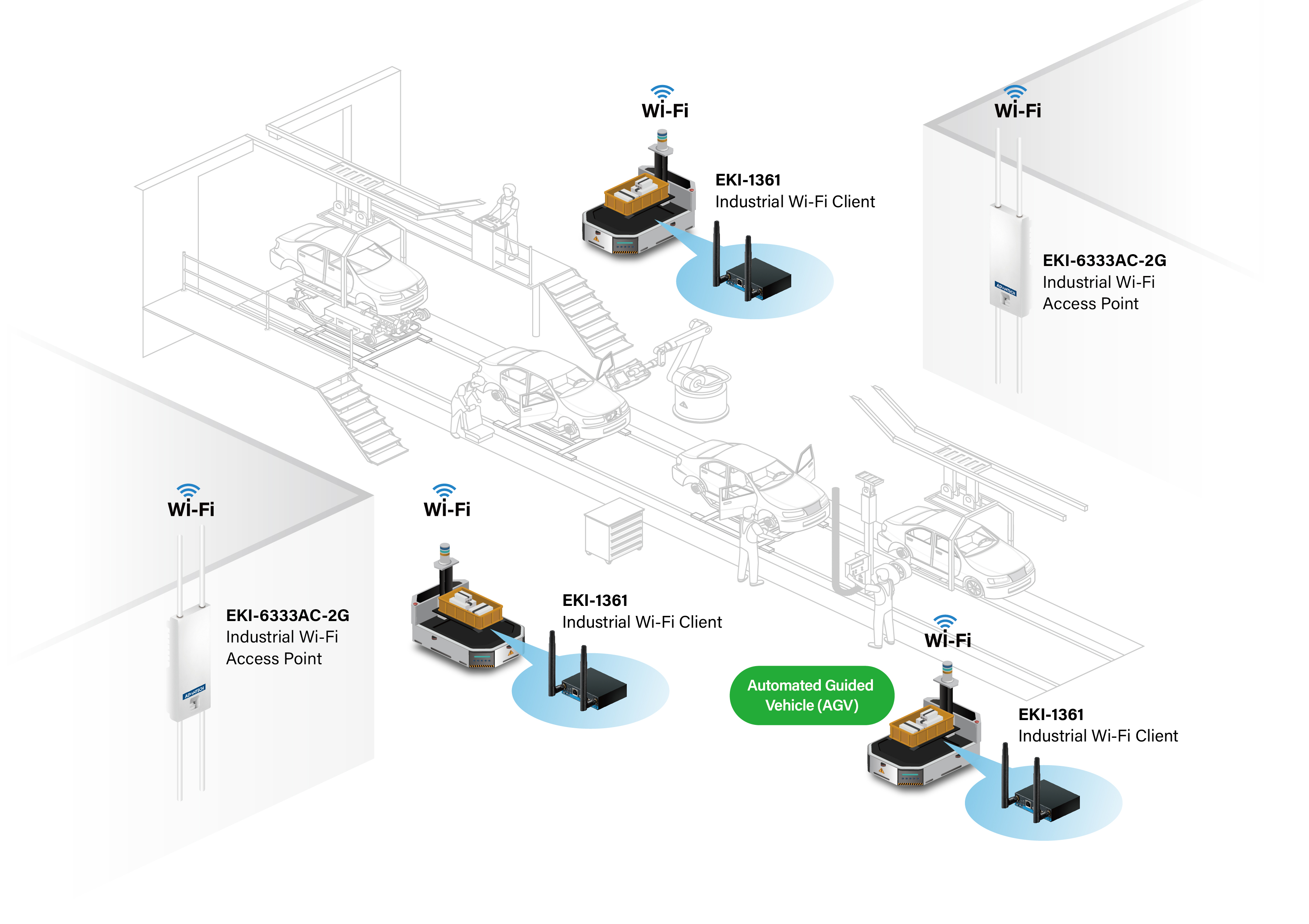 For this case, an integrated RGV solution was used to automate the production line and provide a flexible manufacturing system. Battery pack production lines were equipped with rails and RGV trolleys for handling materials and transporting battery cells and modules. To provide wireless communication capabilities, Advantech’s EKI-1361 Wi-Fi clients and EKI-6333AC-2G Wi-Fi access points (APs) were leveraged as key components.