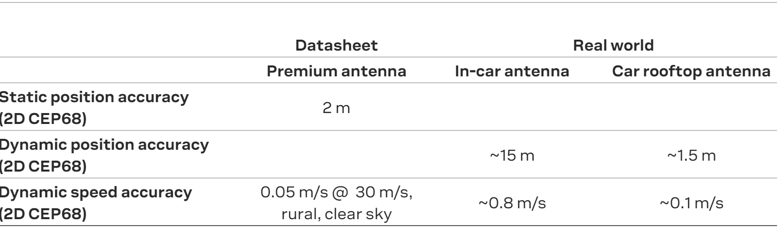 In the table below, we compare its performance in terms of accuracy and speed with the performance of the roof-top antenna and the datasheet figures. The difference is significant (and because of a statistical fluke, our dynamic position accuracy actually beat the datasheet value).