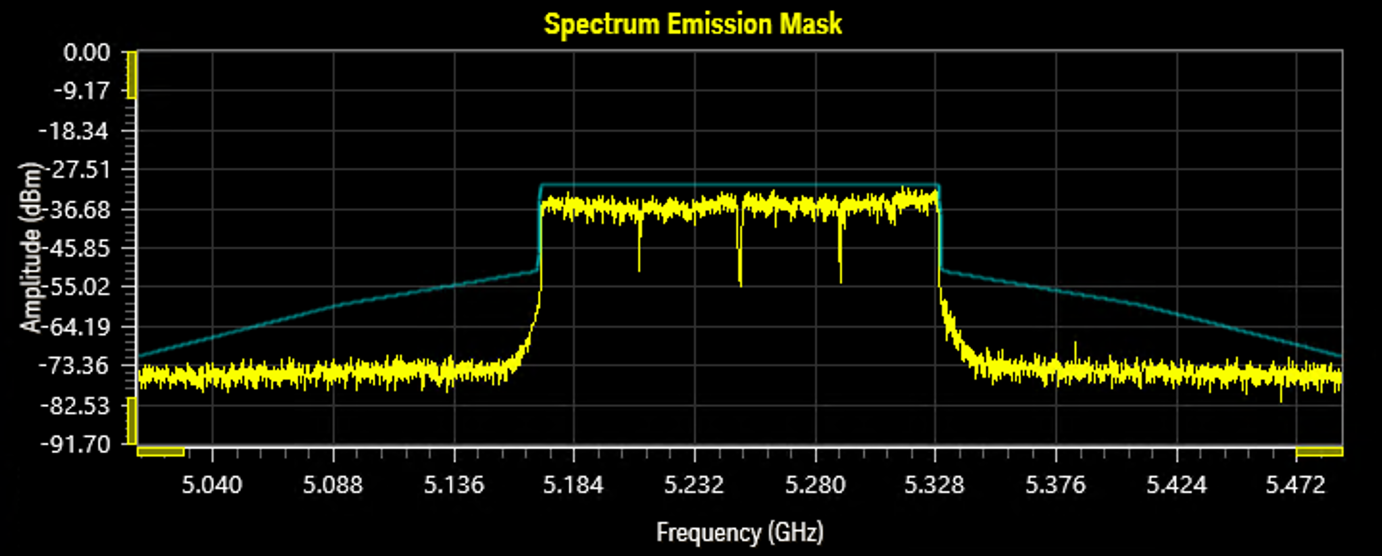 The measurement of the transmit spectrum mask is a critical process. It outlines the energy profile across different frequencies. An example is shown in Figure 3. By establishing specific thresholds at various segments of the signal, a defined spectral envelope is created for the DUT. That means the operating frequency of this DUT must fall within the envelope to prevent unwanted interference and ensure sufficient power delivery. This is important for both APs and clients.