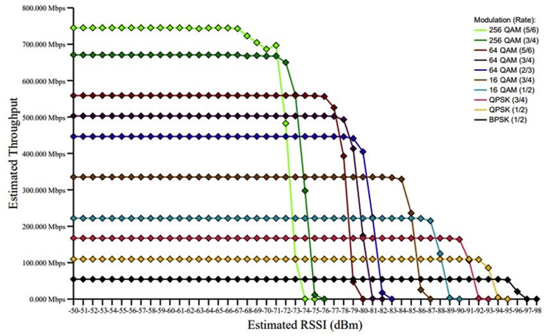 To assess receiver sensitivity, a network emulator with a signalling mode sends out Wi-Fi signals at decreasing power levels, starting from the highest. This continues until the point where the receiver fails to recognise the signal. Plotting these results visually is an effective method to pinpoint where the receiver’s sensitivity starts to decline. See an example in Figure 4. This process benefits greatly from automation, especially when evaluating the packet error rate (PER) against power levels across various MCS rates and device settings.