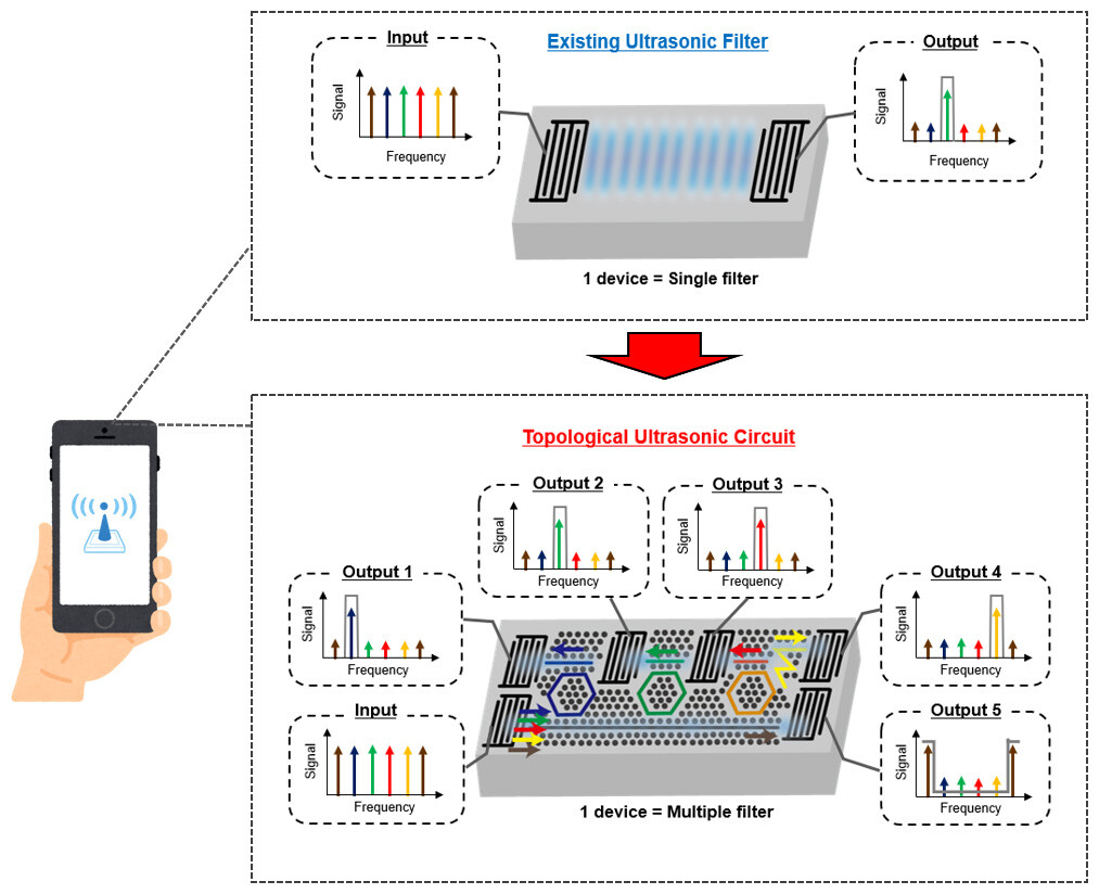 Figure 1 Schematic diagram of an existing ultrasonic filter (top) and a topological ultrasonic circuit (bottom) Note. Existing ultrasonic filters have a single filter function per device. On the other hand, topological ultrasonic filter circuits can integrate multiple filters on a substrate, which makes it possible to realise multiple filter functions per device.
