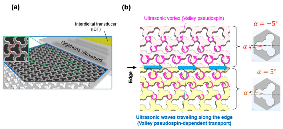 The waveguide structure has two types of topological structures consisting of periodic holes tilted five degrees counterclockwise or clockwise. When an external ultrasonic wave is applied to the edge (junction surface) of this structure, valley pseudospins3 is generated, which rotates in opposite directions, and ultrasonic wave propagation proceeds along the edge in one direction.
