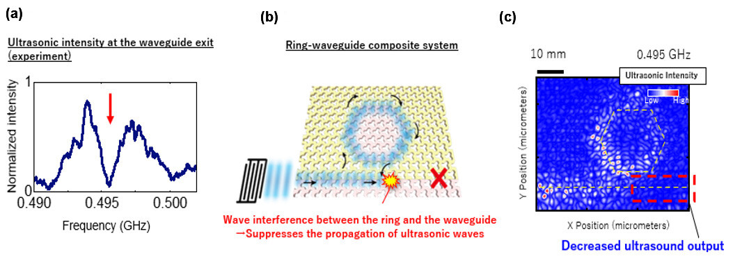 By utilising this characteristic, they solved the problem of reflection in the folded small waveguide structure, which was difficult with the conventional technology, and miniaturisation and compounding of ultrasonic devices became possible. They fabricated a ring/waveguide coupling structure that reduced the space required by conventional technology to less than 1/100 and demonstrated the basic operation of a gigahertz ultrasonic filter.