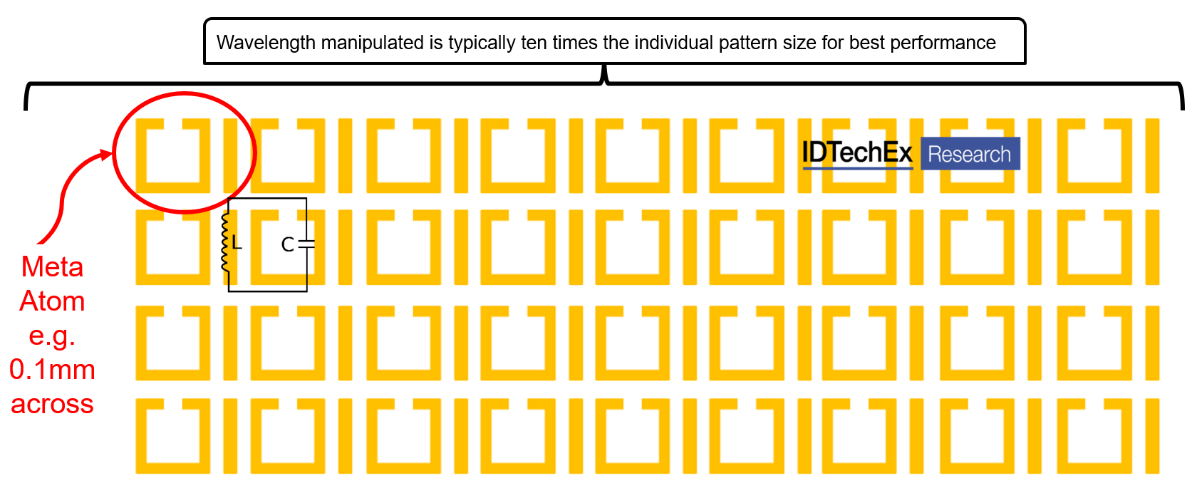 Currently, microwave frequencies of tens of GHz are a focus because that is your 5G mobile phone system and a lot of radar, from driverless cars to military targetting. Each repeated pattern is called a meta-atom because it behaves rather like an atom when about one-tenth of the wavelength is being manipulated. For example, negative permittivity and negative magnetic permeability can give negative refractive index bending light and other radiation the wrong way.