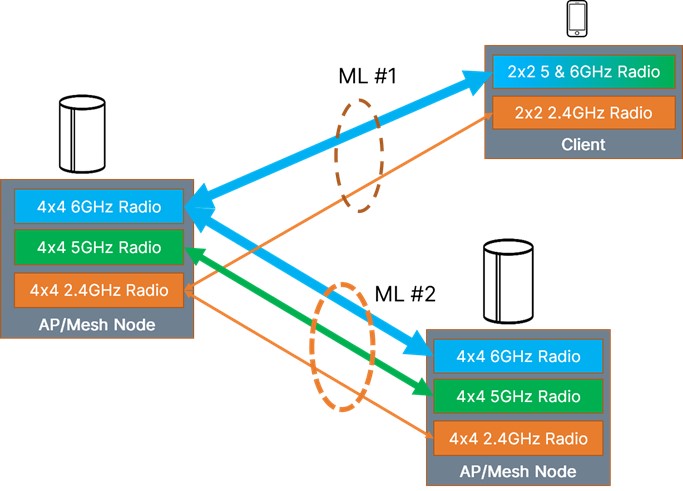 If we consider a mesh network comprising triband (6GHz, 5GHz, 2.4GHz) mesh nodes or access points (APs), MLO creates a high-speed, low-latency wireless backbone for the home network while also delivering fronthaul for the devices connected to the mesh nodes/APs. Supposing each mesh node is capable of supporting a 4×4 triband concurrent configuration, then the aggregate backhaul (backbone) will be able to support rates up to 21.6Gbps. Backhaul is more reliable and robust when MLO is incorporated.