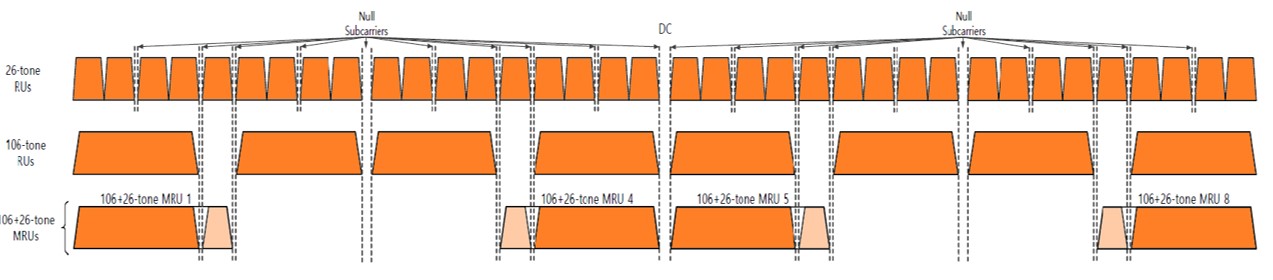 In Wi-Fi 7, these MRU mechanisms enable the use of orthogonal frequency division multiple access (OFDMA) and/or non-OFDMA modes for greater versatility. OFDMA mode gives small and large MRUs greater flexibility to allocate the RU/MRUs without complicating the MAC and scheduler designs while the non-OFDMA mode provides more options in the preamble puncturing of subchannels.