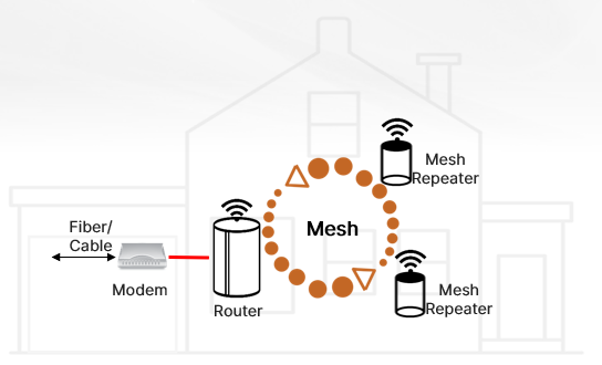 Apart from having limited range, Wi-Fi signals are also blocked by some building materials meaning ‘dead spots’ (where signal coverage is poor) are a problem. The Wi-Fi mesh topology uses a series of Wi-Fi extenders (repeaters) to provide better indoor signal coverage. These work in combination to boost signal coverage in areas which the main router signal cannot reach.