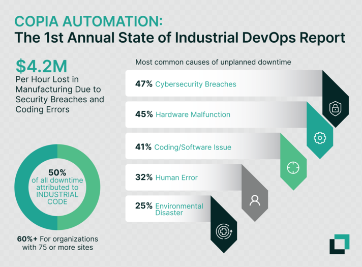 “The cost of downtime minimises or eliminates the margin between profitability and failure for manufacturers,” said Copia Co-founder and CEO Adam Gluck. “With coding errors and cyber security breaches shown as significant causes for downtime, manufacturers need to take every technological measure to protect their bottom line and ensure continuous operations with enhanced productivity. Industrial DevOps delivers the technology and the process change to do this.”