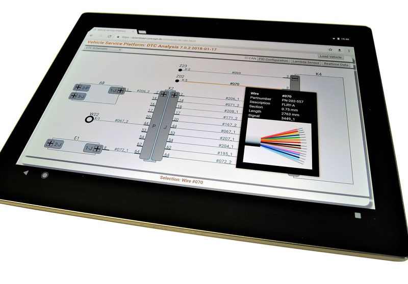 A technician calls up a specific service schematic diagram based on the Vehicle Identification Number (VIN) and then using either the relevant Diagnostic Trouble Codes (DTC) or alternatively based on component, location or part information, focuses the display on a specific area. Detail of components, wiring, and other information may be dialed up for exact analysis of problem scenarios, see figure 2.