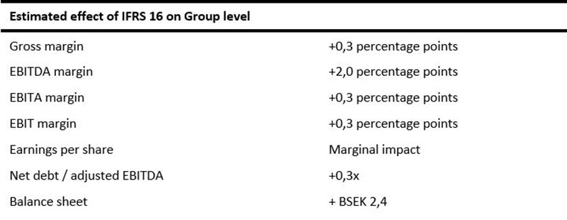 In addition, Ahlsell will provide an update on the estimated effect of the new IFRS 16 regulatory framework on financial reporting when the framework is introduced in January 2019. The reporting for segments, Sweden, Norway, Finland, Denmark, Other and Central, will not be affected. Adjustments following IFRS 16 will only be made at Group level.