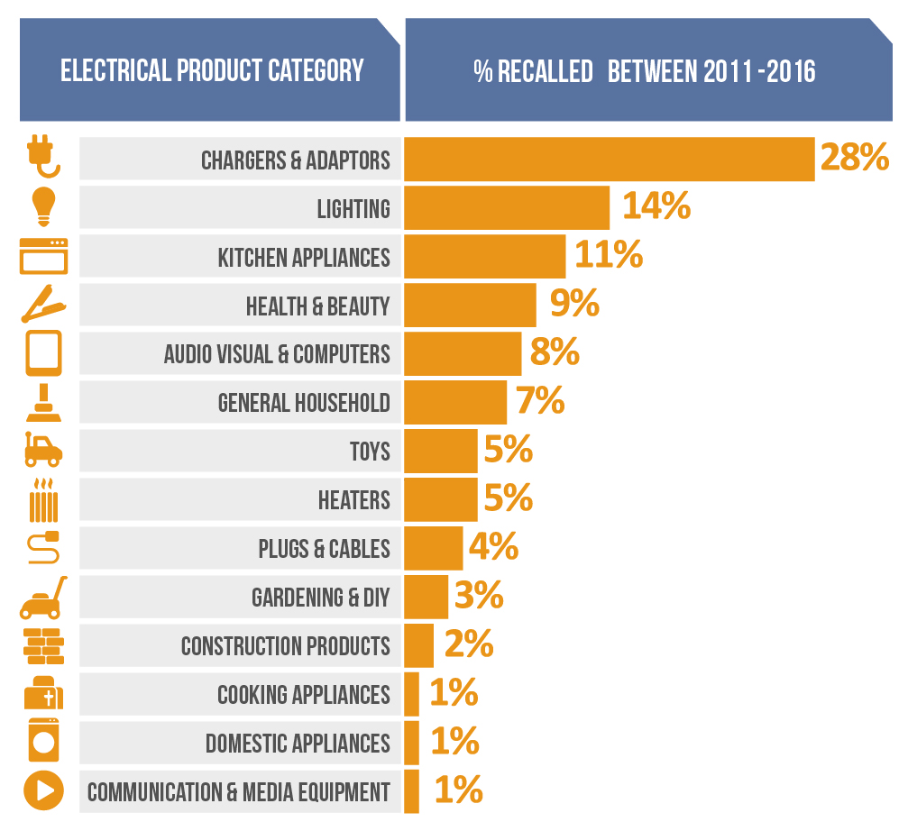 The research revealed that there was a total of 358 recorded electrical product recalls between 2011-2016 on the Electrical Safety First database.