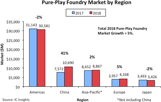 With the recent rise of the fabless IC companies in China, the demand for foundry services has also risen in that country. In total, pure-play foundry sales in China jumped by 30% in 2017 to $7.6bn, triple the nine percent increase for the total pure-play foundry market that year. Moreover, in 2018, pure-play foundry sales to China surged by an amazing 41%, over eight times the five percent increase for the total pure-play foundry market last year.