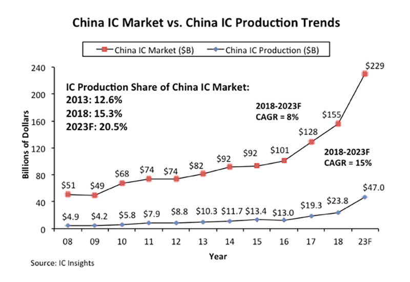 As shown below, IC production in China represented 15.3% of its $155bn IC market in 2018, up from 12.6% five years earlier in 2013. Moreover, IC Insights forecasts that this share will increase by 5.2% points from 2018 to 20.5% in 2023.