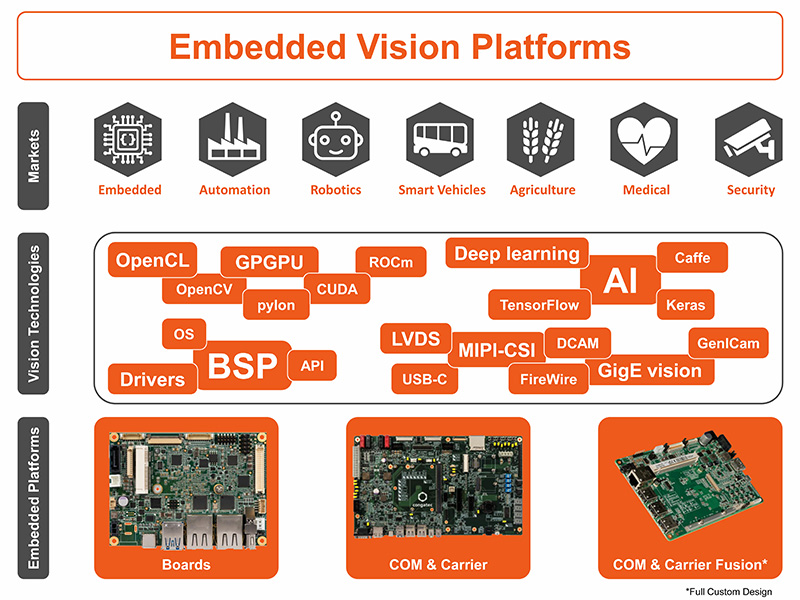 Several embedded vision platforms with integrated AI have further been presented in cooperation with Basler, a company specialising in machine vision. Multifunction platforms that integrate all mentioned functions are already available as an industrial edge computing platform, based on COM Express Type 6 modules with Intel Xeon processors and featuring three application-ready, preconfigured virtual machines. One operates a Basler vision camera where the vision-based object recognition runs on Linux via the Intel OpenVINO software.