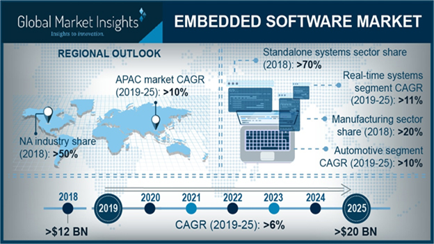 North America embedded software market held a major share of over 50% in 2018 due to the presence of key players such as Intel, Microsoft, and IBM in the region. The rise in demand for IoT and connected devices to offer smart and connected devices and reduce human intervention in the US is helping the market growth.
