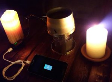 Place a candle on top of the device, fill it with five ounces of water, light the candle and plug your phone into the USB port — then you’re charging.