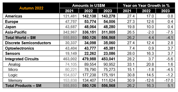 For 2023, the global semiconductor market is projected to decline by 4.1% to $557 billion, driven by the memory segment. In this latest forecast, this category is projected to fall to $112 billion in 2023, dropping by 17% compared to the previous year. Some other major categories showing single-digit growth like optoelectronics, sensors, discretes and analogue.