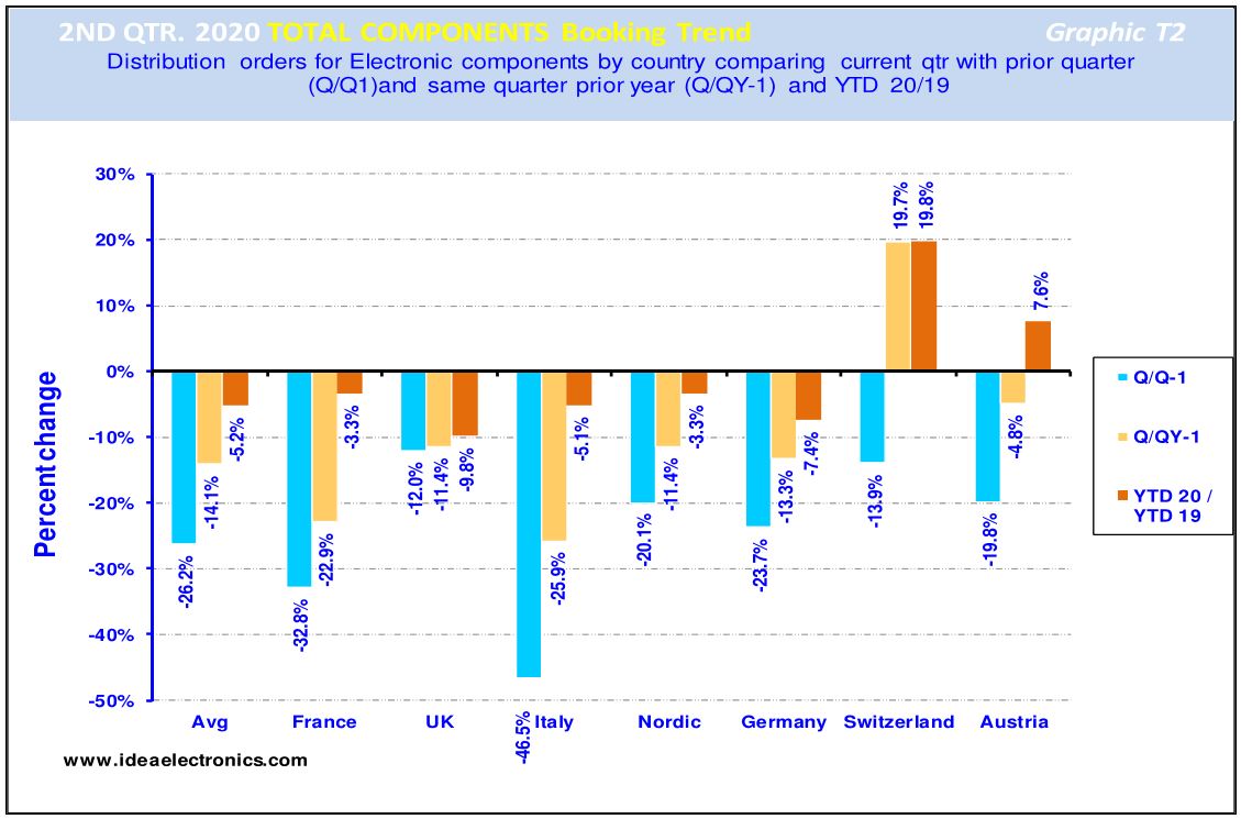 Graphic T2 compares the total electronic components ‘Bookings’ result achieved in each European country in Q2’20 and contrasts and compares these figures with the result they achieved in the previous quarter and those achieved in the same period last year.