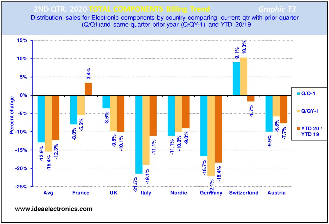 Graphic T3 illustrates total electronic components ‘Billings’ achieved in European markets in Q2’20 and contrasts and compares the results with the previous quarter’s results and those achieved in the same period last year.
