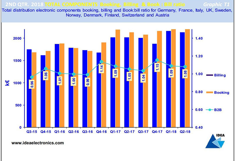 The light brown bar compares Q2’18 with the same quarter 2017 and indicates that Bookings growth in the UK and Germany components markets increased faster than the European average of 8.2% in the period. However, all European electronic components markets enjoyed strong Bookings growth in the quarter, averaging out at 8.2%.
