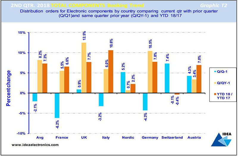 The light brown bars compare Q2’18 with the same quarter the previous year and reveals that with the exception of the French electronic components market, all European components markets experienced growth averaging 5.4%, with the UK, Italy and Austrian markets growing faster than the average.