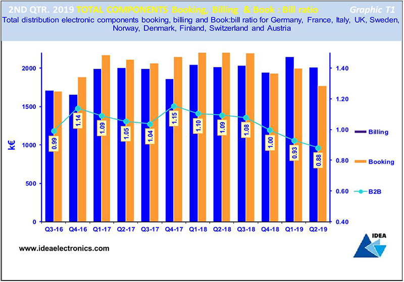 Graphic T3 illustrates total electronic components ‘Billings’ achieved in European markets in Q2’19 and contrasts and compares the results with the previous quarter’s results and those achieved in the same period last year.