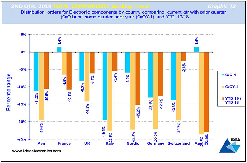 The light brown bars compare Q2’19 with the same quarter last year revealing that European electronic components markets grew by an average of just 0.3%. The French, German and Swiss markets did best, but growth rates in the tenths of one percent are at best marginal.