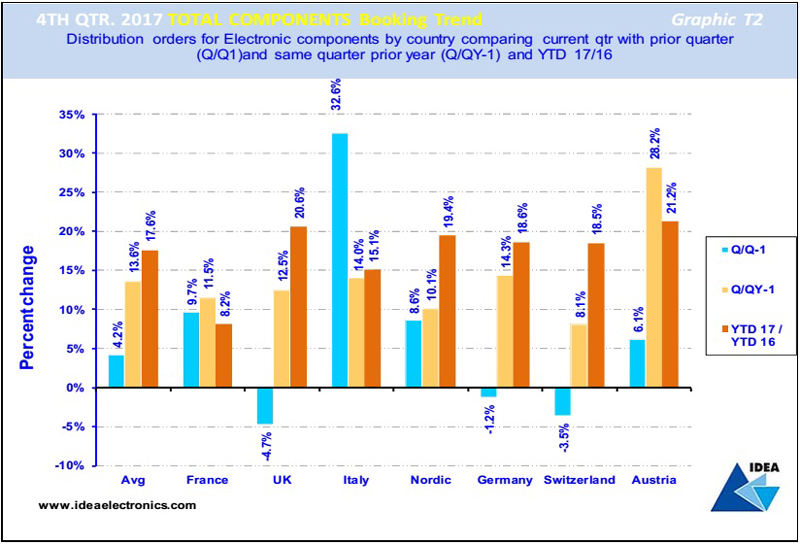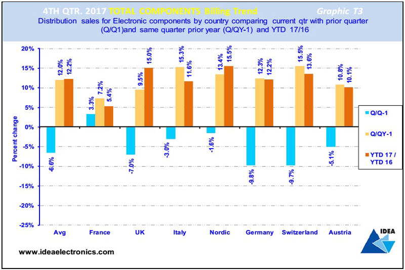 Graphic T3 illustrates total electronic components Billings achieved in Europe in Q4 2017. The blue bar compares this quarter with the previous one and reveals that – except for France – every country’s electronic components markets declined in the period, averaged out at (6.6%). The light brown bar compares Q4 2017 with the same quarter the previous year and shows that all European electronic components markets experienced strong Billings growth in the quarter, achieving average growth of 12%. The dark brown bar compares the current year to date Billings with the same period in 2016, revealing an average Billings growth rate over the 12-month period of 12.2%.