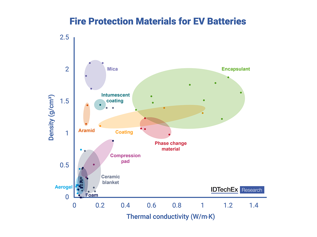 Many properties are key for choosing the optimal fire protection material, thermal conductivity, density, thickness, dielectric strength, maximum fire protection temperature, and cost. Each of these factors is important in isolation but must be considered at a pack level. A material can be very lightweight, but if a large amount is required in order to provide protection, then it may not be the best solution. Likewise, if a material has to be paired with others to provide all the necessary functions, then it may impact its performance and cost-effectiveness.