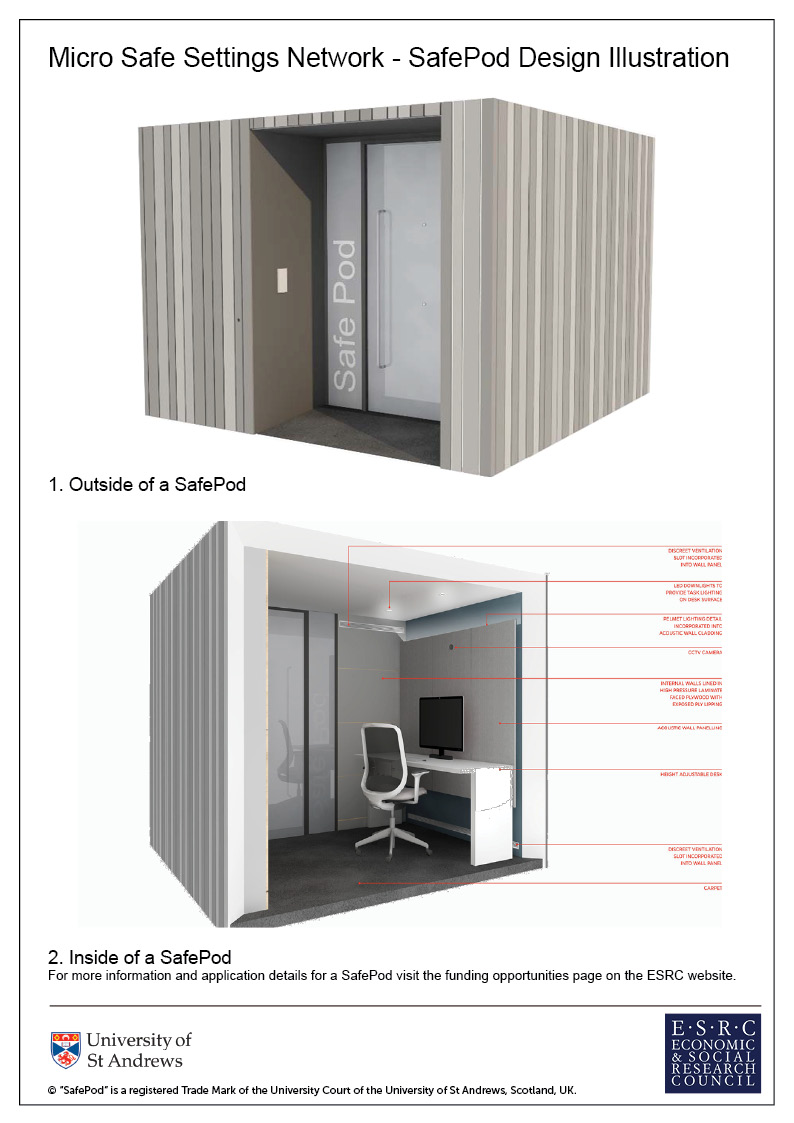 SafePods have been designed and developed at the University of St Andrews. They provide the security and safety features that exist in a traditional safe setting, but are also compact enough in size for placement into organisations where space may be at a premium.