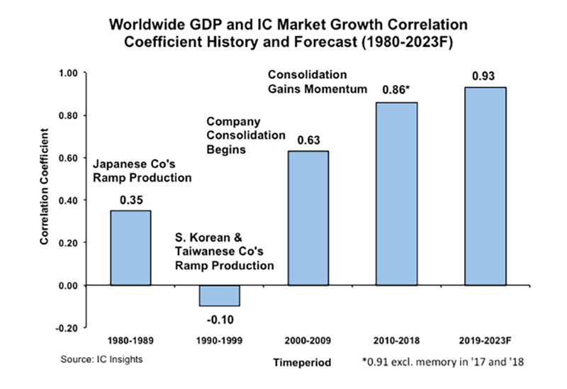 Over the 2010-2018 timeframe, the correlation coefficient between worldwide GDP growth and IC market growth was 0.86 (0.91 excluding memory in 2017 and 2018), a strong figure given that a perfect positive correlation is 1.0. In the three decades previous to this time period, the correlation coefficient ranged from a relatively weak 0.63 in the early 2000s to a negative correlation (i.e., essentially no correlation) of -0.10 in the 1990s.