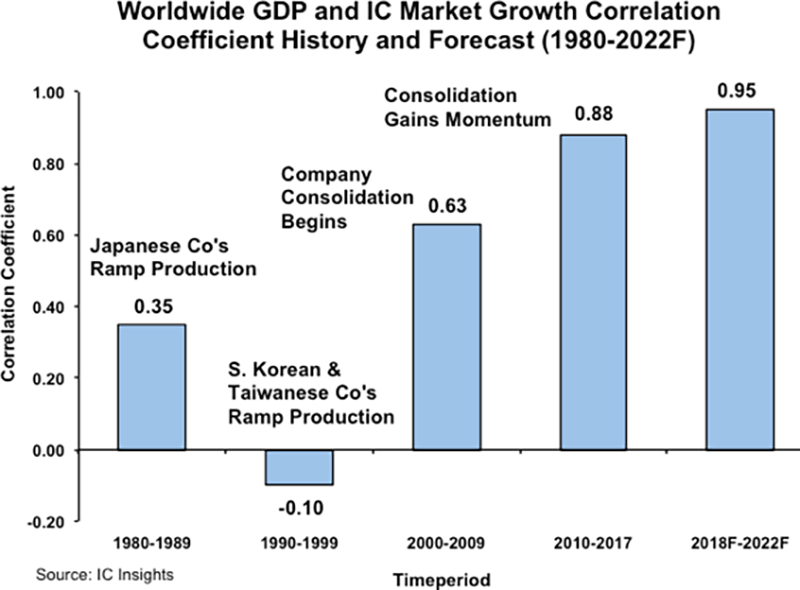 As shown, over the 2010-2017 timeframe, the correlation coefficient between worldwide GDP growth and IC market growth was 0.88, a strong figure given that a perfect correlation is 1.0. In the three decades previous to this time period, the correlation coefficient ranged from a relatively weak 0.63 in the early 2000s to a negative correlation (essentially no correlation) of -0.10 in the 1990s.
