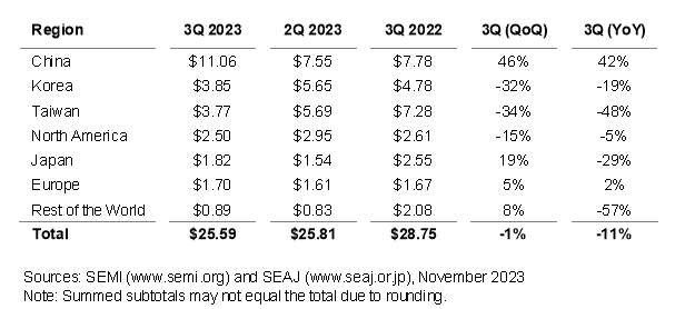 “The Q3 2023 dip in equipment billings was due to softening chip demand,” said Ajit Manocha, SEMI President and CEO. “However, China has shown strong demand and spending power for mature-node technologies, a sign of the industry’s resilience and growth potential in the long run.”