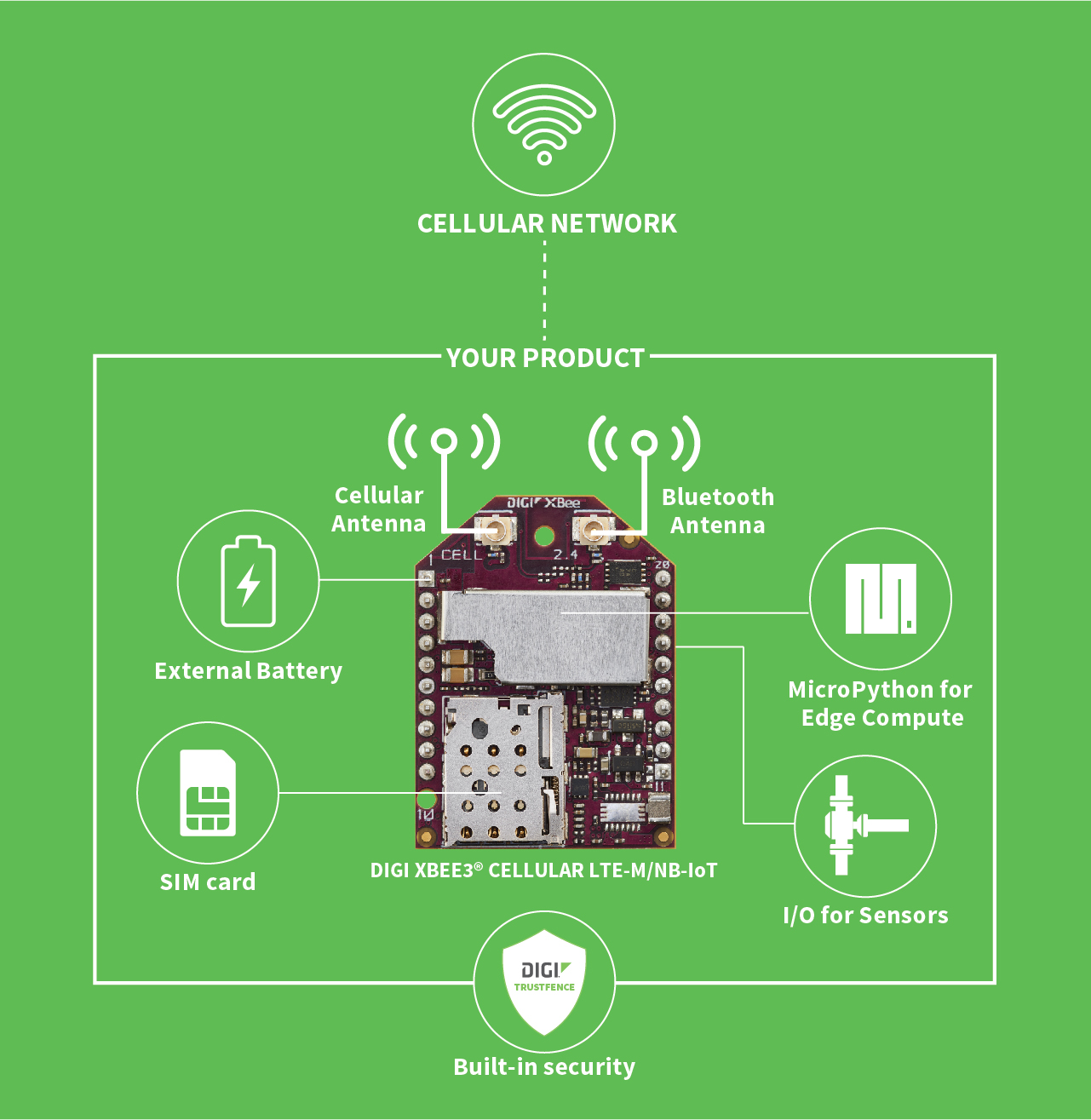 The module includes integrated MicroPython and API/AT modes. No host microcontroller is required. There is also Digi TrustFence security framework integrated into the module, to secure device deployment with features such as secure boot.