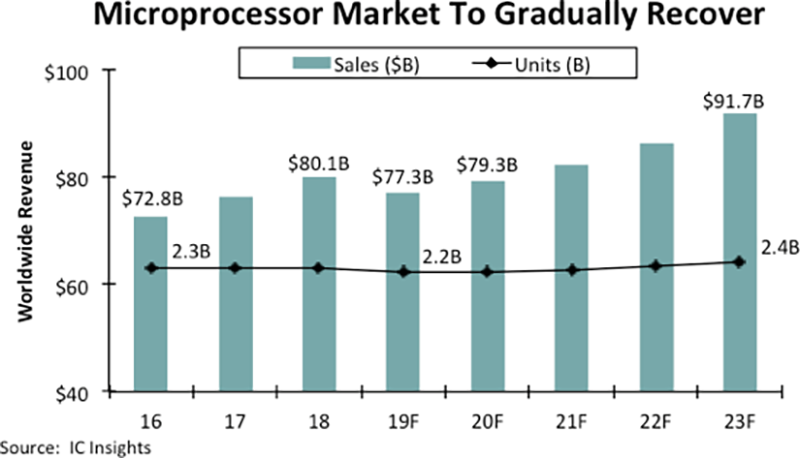 Microprocessor sales are expected to stage a modest rebound in 2020, growing 2.7% to $79.3bn and then are forecast to reach a new record-high level of about $82.3bn in 2021, based on IC Insights’ outlook for MPUs in the ‘Mid-Year Update’ to the ‘2019 McClean Report’.