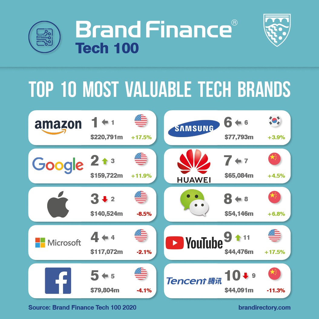 Breaking the so far unattainable US$200 billion brand value mark, following 18% growth, Amazon remains a cut above the rest. While most brands are experiencing or expecting a slump in revenue during the pandemic, Amazon is set for continued growth. As with fellow e-commerce brands, Amazon has been benefitting from the unprecedented surge in demand as consumers turn online following store closures.