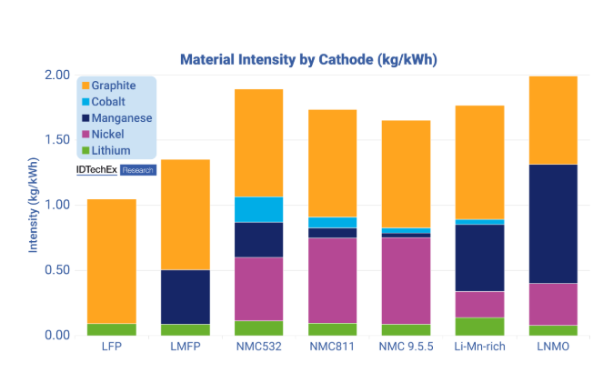 Intensity of key materials in different Li-ion cell chemistries. Source: IDTechEx