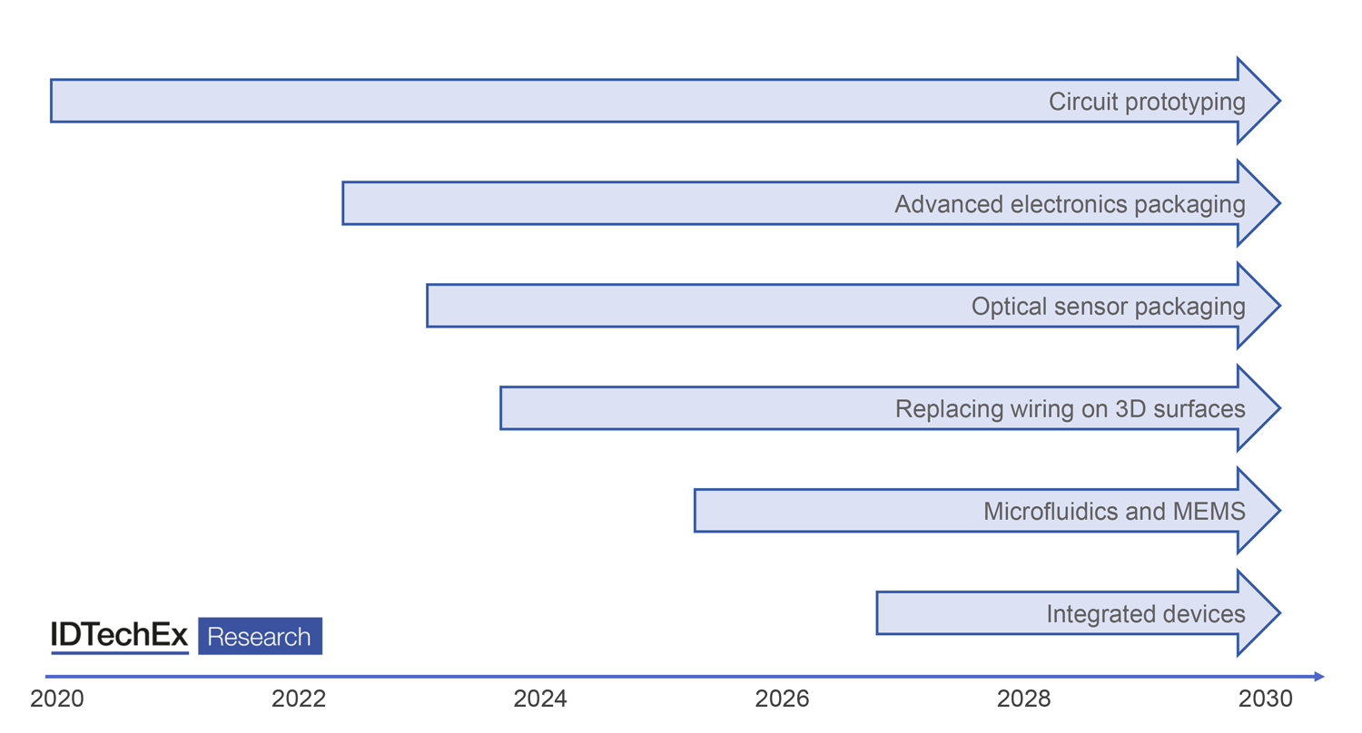 IDTechEx divides the sector into two aspects: ‘fully additive’ and ‘printing onto 3D surfaces’. Both have multiple application opportunities that IDTechEx believes will develop over the next decade.