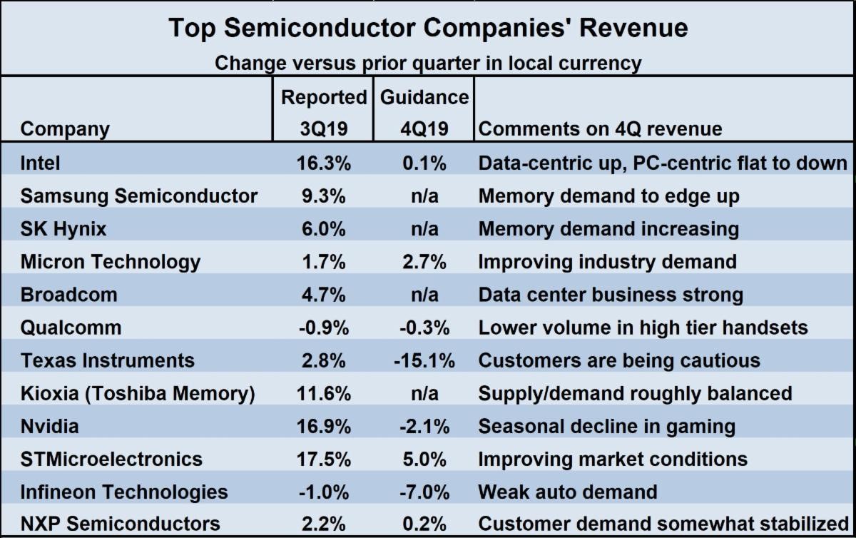 Reported revenue results from the top semiconductor companies demonstrate the pickup. 3Q 2019 revenues versus 2Q 2019 were up by double digits for four the of the twelve companies below, led by STMicroelectronics’ 17.5%.