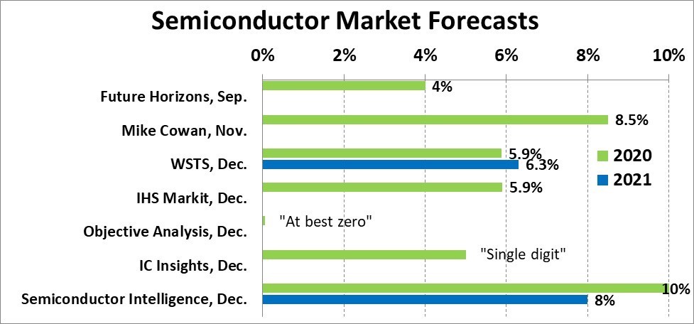 The semiconductor market recovery in the second half of 2019 will lead to growth in 2020. Objective Analysis is the most pessimistic, forecasting 2020 to be up ‘at best zero’. IC Insights projects single digit growth. Future Horizons, usually the most optimistic, expects four percent. WSTS and IHS Markit are both at 5.9%. The highest projections are Mike Cowan’s 8.5% and our Semiconductor Intelligence’s 10%.