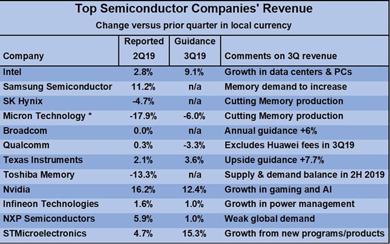 The memory companies (SK Hynix, Micron and Toshiba) experienced revenue declines, except for Samsung which grew 11.2%. A few companies expect healthy growth in 3Q 2019 revenues, ranging from 9.1% from Intel to 15.3% from STMicroelectronics. TI, Infineon and NXP project low single digit growth. Micron and Qualcomm expect revenue declines.