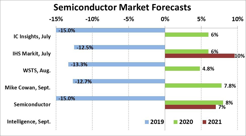 Recent semiconductor market forecasts call for 2019 to be decline about 13% to 15%. We at Semiconductor Intelligence are sticking with our June forecast of a 15% decrease. Forecasts for 2020 are in a relatively narrow range, from 4.8% by WSTS to eight percent by Semiconductor Intelligence. For 2021, IHS Markit projects accelerating growth to ten percent from six percent in 020. Our Semiconductor Intelligence forecast is for slightly slower growth in 2021 of seven percent compared to eight percent in 2020.