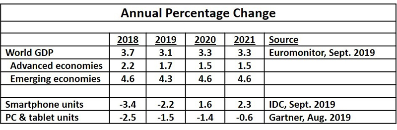 What are the drivers of the semiconductor forecast? One key is gross domestic product (GDP) which measures overall economic activity. The September forecast from Euromonitor shows a slowing of World GDP growth from 3.7% in 2018 to 3.1% in 2019. GDP growth picks up slightly to 3.3% in 2020 and 2021. The advanced economies (including the U.S., Euro area, UK, Canada and Japan) decelerate from 2.2% growth in 2018 to 1.7% in 2019 and 1.5% in 2020 and 2021.