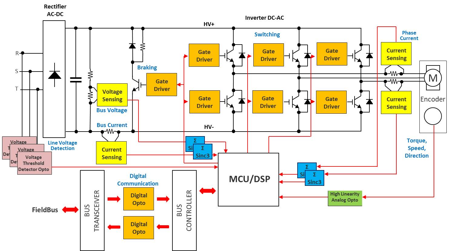 One of the most expensive devices in a motor control system is a power semiconductor switching device like the IGBT or power MOSFET. Switching at high frequency, these power devices introduce unintended noise and high-voltage transients across the control system. The high-frequency transient may affect the normal operation of the sensitive, expensive microcontroller. Sigma-delta modulators, in combination with superior optical coupling isolation technology, deliver high noise margins and excellent immunity against isolation mode transients. With a minimum distance through insulation (DTI) of 0.5mm, these sigma- delta modulators provide reliable double protection and a high working voltage suitable for failsafe designs. This proven isolation performance is superior to magnetic or capacitive-based isolators, where DTI is only a third of 0.1mm.
