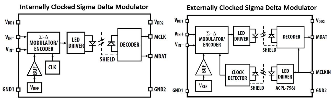 Broadcom’s ACPL-796J and ACLP-C799 optically isolated sigma-delta modulators are two types of sigma-delta modulators, based on whether the clock source is internally built-in or externally provided to the modulator. For the internally clocked type, a 10MHz clock is built in at the primary side of the isolation barrier where the sigma-delta encoder is located. The clock signal is encoded together with the data and coupled across the isolation barrier to the secondary side of the isolation barrier where the clock and data signals are decoded. The externally clocked- in type receives the clock signal at frequency ranges from 5.0 to 25MHz at the secondary side. It is then coupled across the isolation barrier to the primary side. At the secondary side of both types of modulators, data is decoded into a high-speed data stream of digital ones and zeros. Figure 2 illustrates the simplified block diagrams of internally and externally clocked sigma-delta modulators.