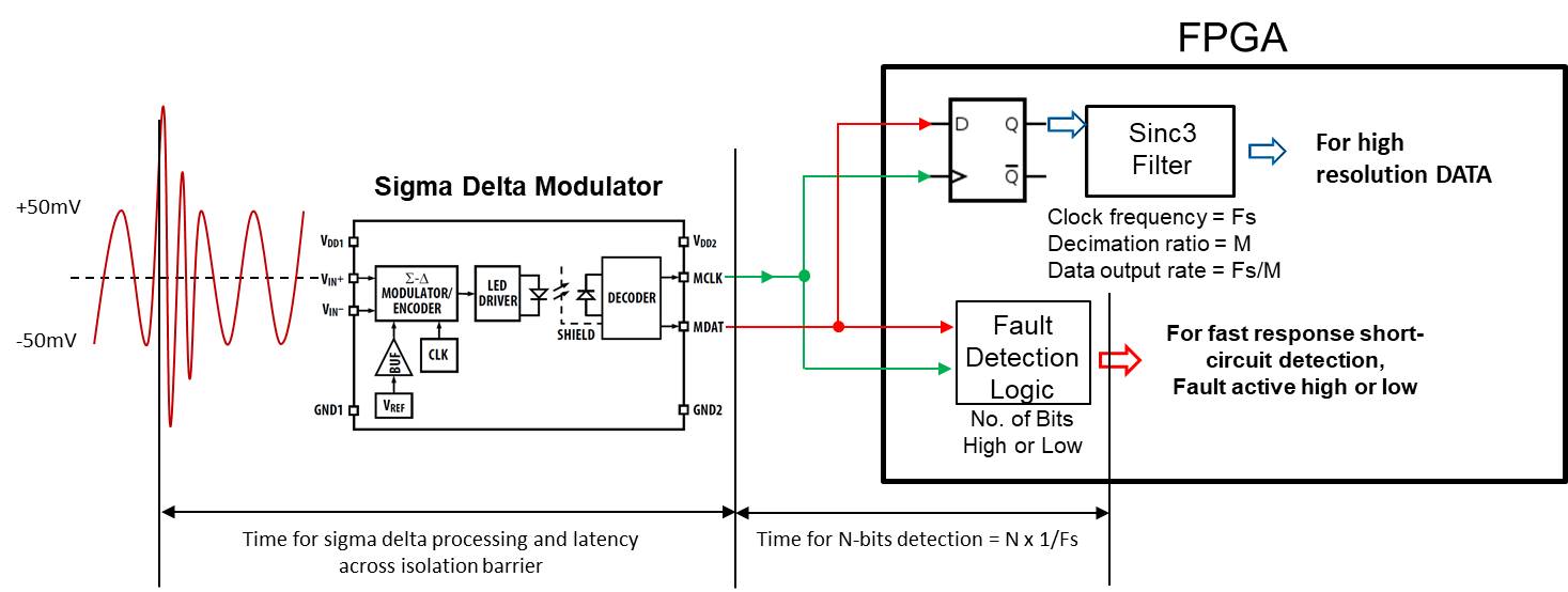 The fast shutdown of the motor control system during an over-current event prevents catastrophic damage to the expensive power semiconductor switching devices. Optically coupled sigma-delta modulators not only provide high-resolution current measurement with proven and reliable fail-safe isolation protection, but additional fast-response over-current fault detection functionality can be easily implemented by feeding the single-bit stream output data directly to a simple bit-stream detection circuitry. This can be accomplished without having to change hardware configuration or increase the component count.